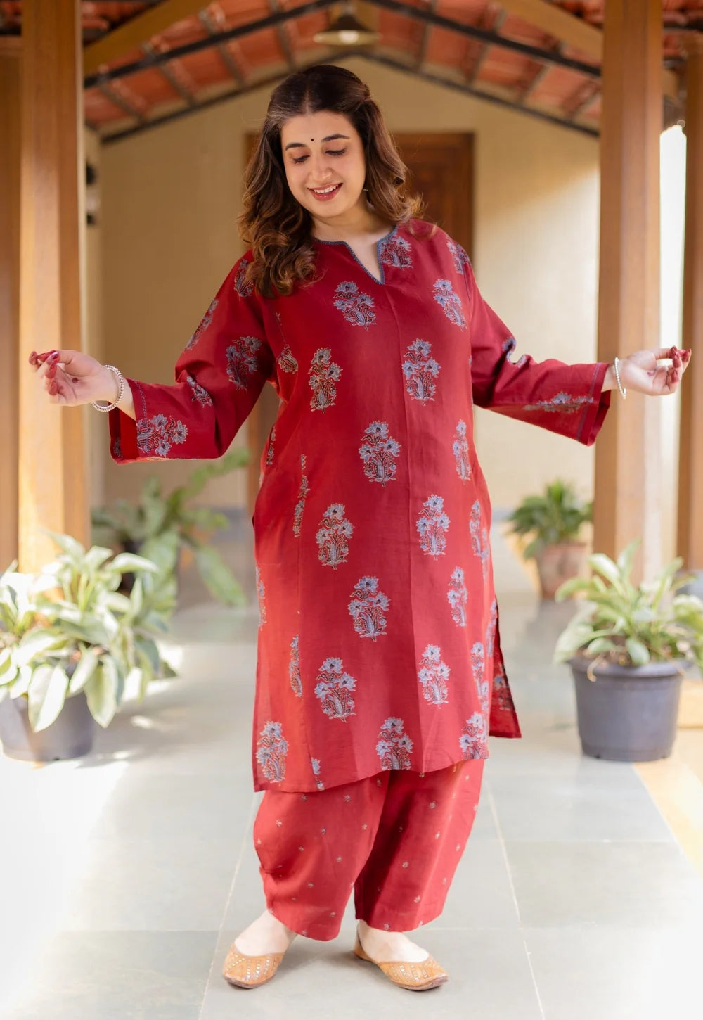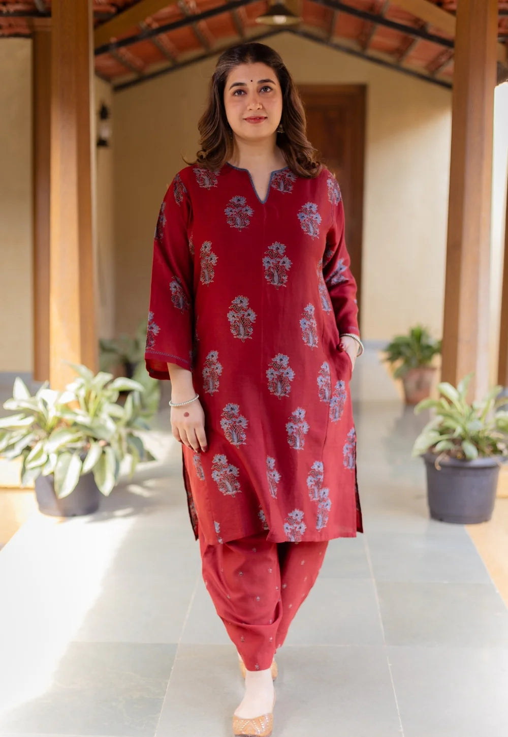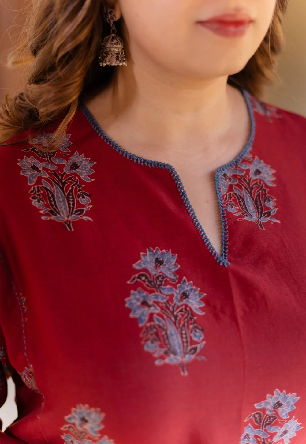 Madder Ajrakh Handblock Printed Chanderi Silk A Line Kurta with Hand Embroidery.