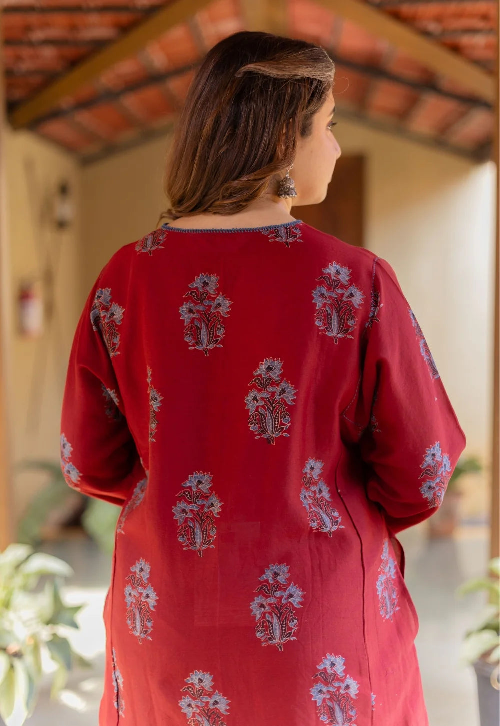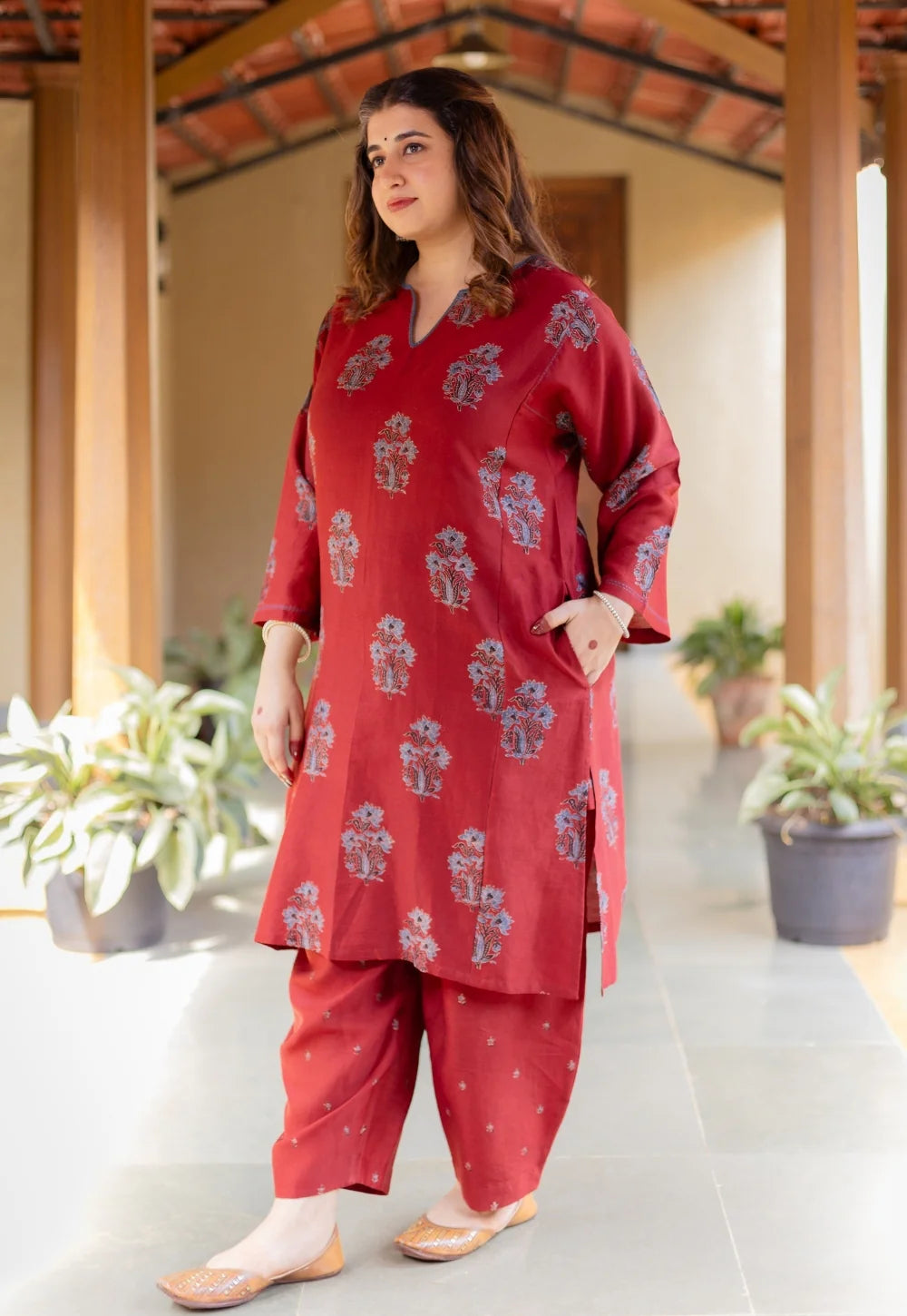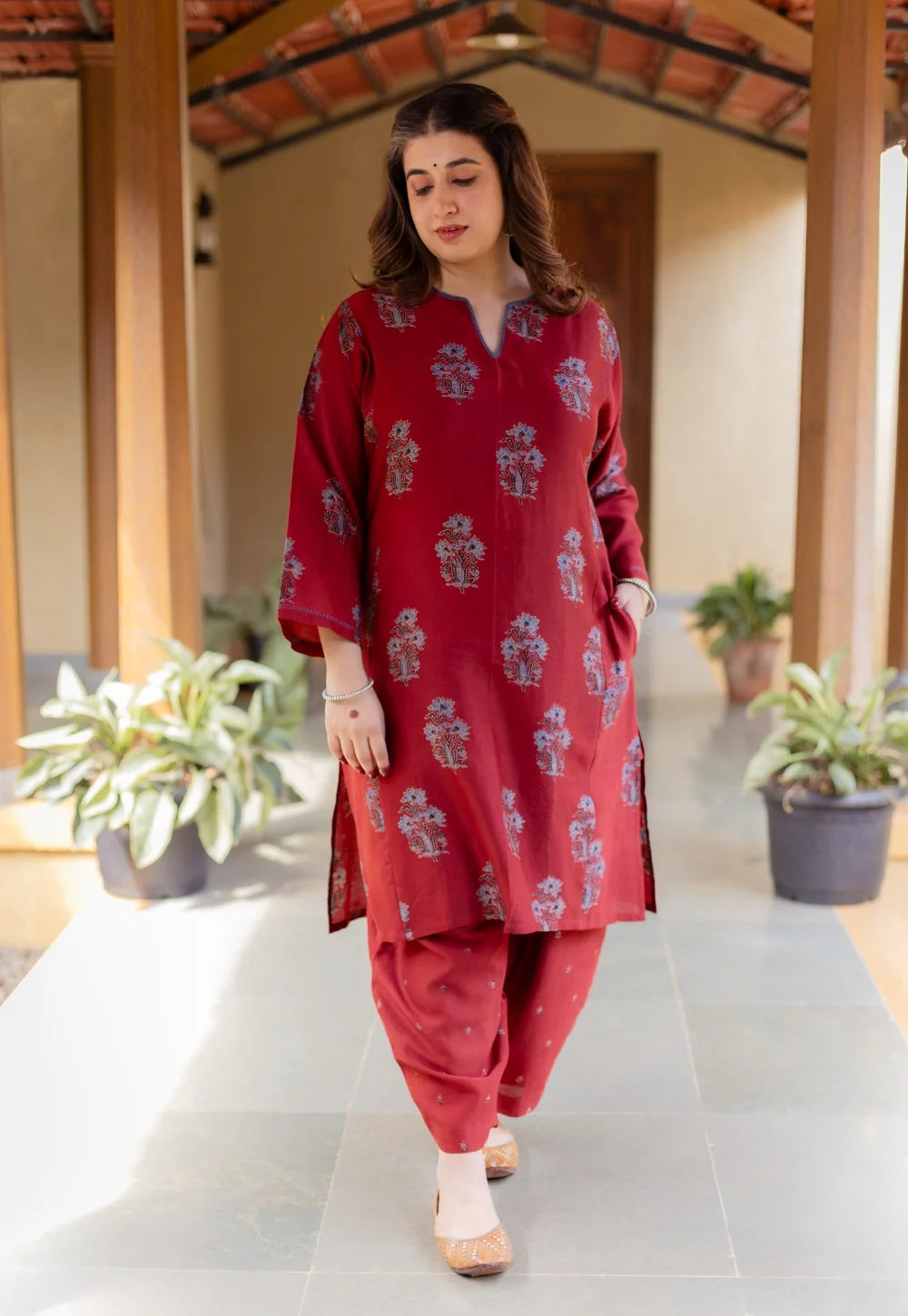 Madder Ajrakh Handblock Printed Chanderi Silk A Line Kurta with Hand Embroidery.