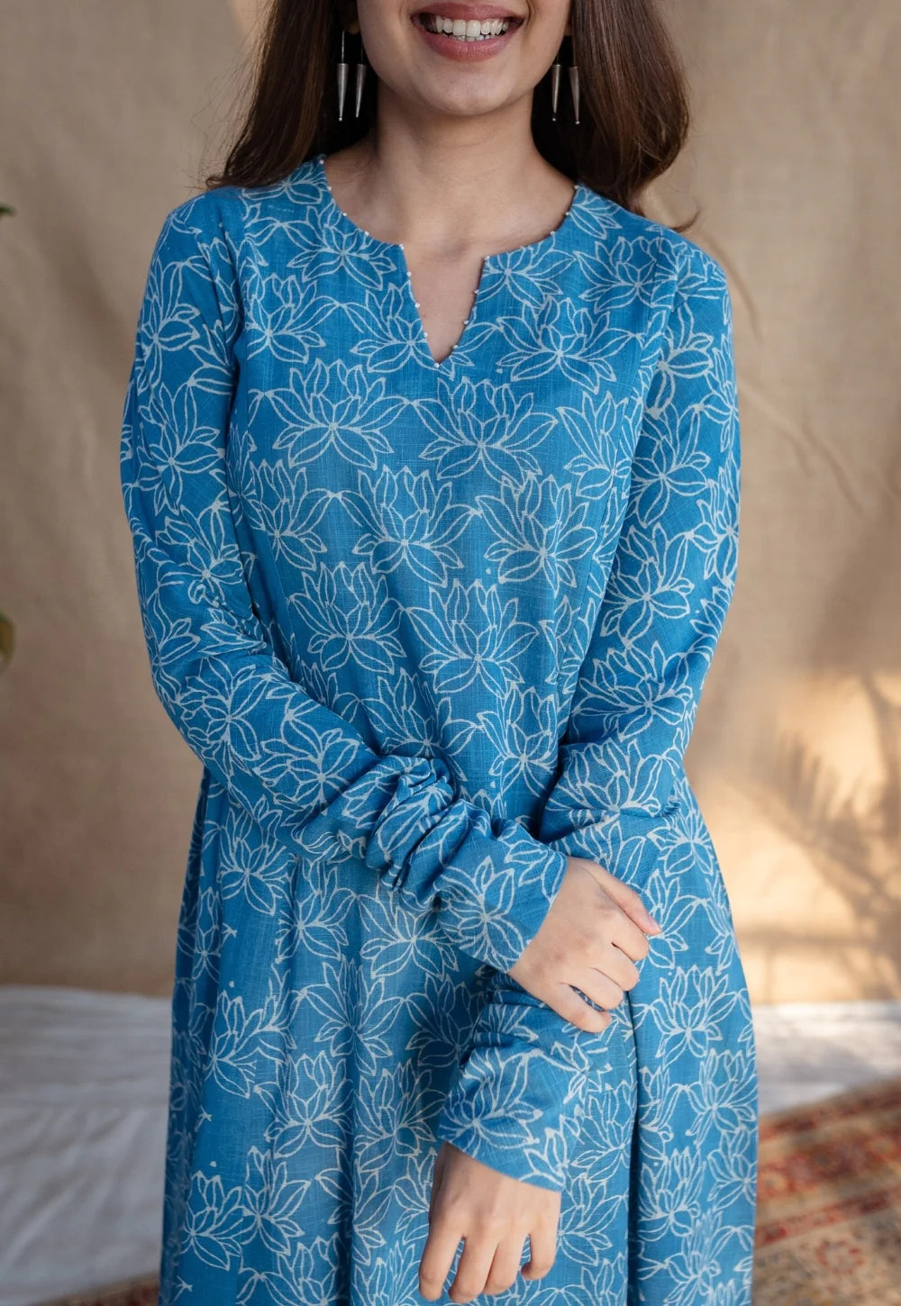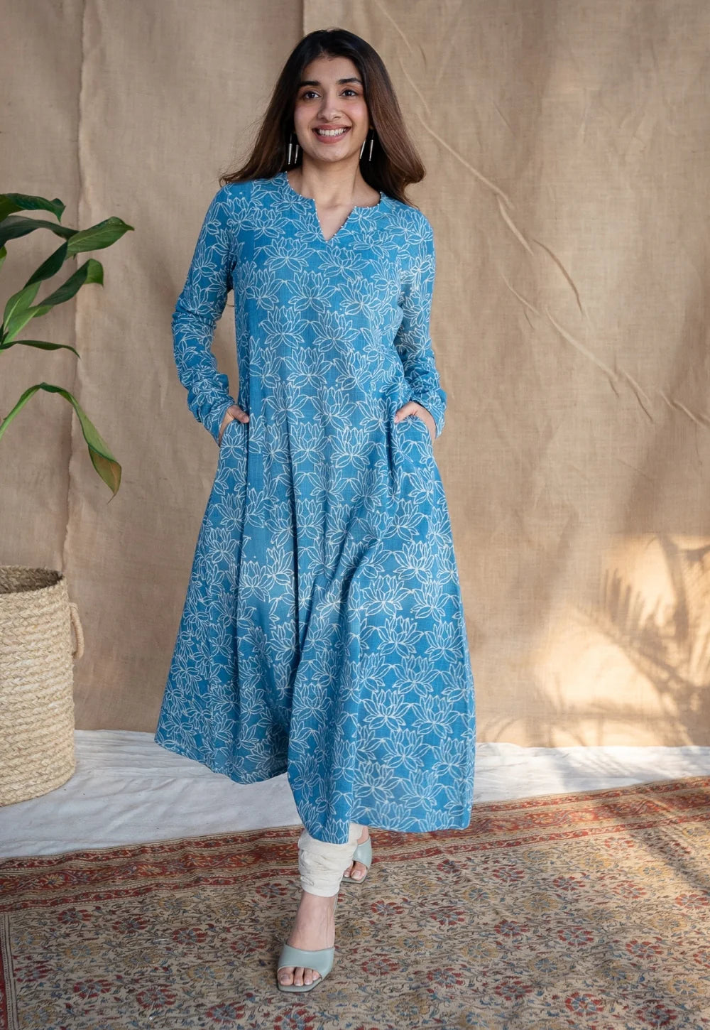 Blue Dabu Handblock Printed Slub Cotton Kali Kurta with Hand Embroidery Details.