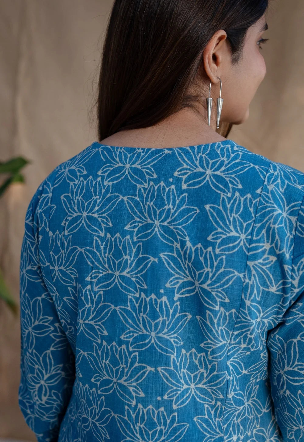 Kaya Blue Kali Dabu Slub Cotton Kurta with Hand Embroidery