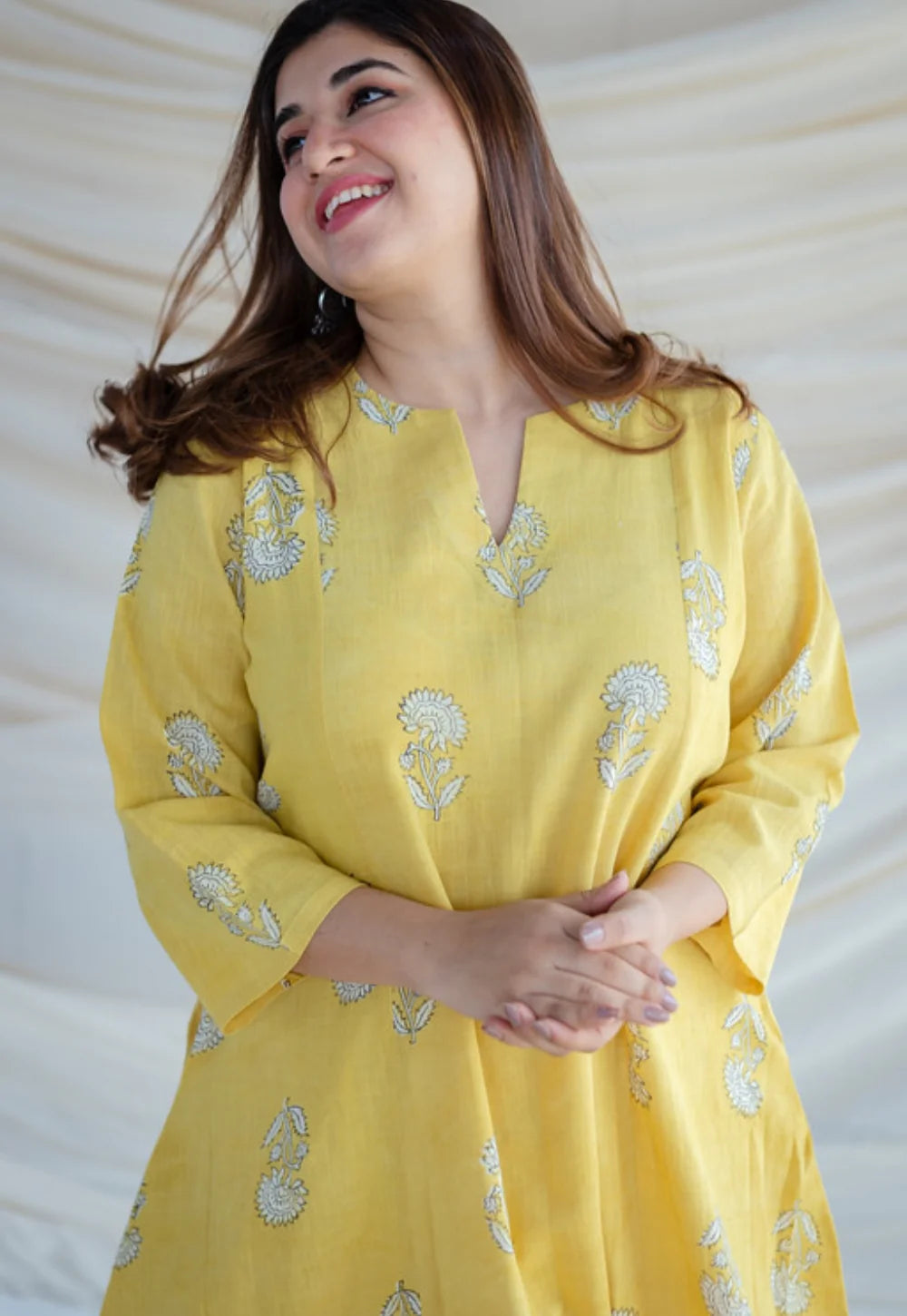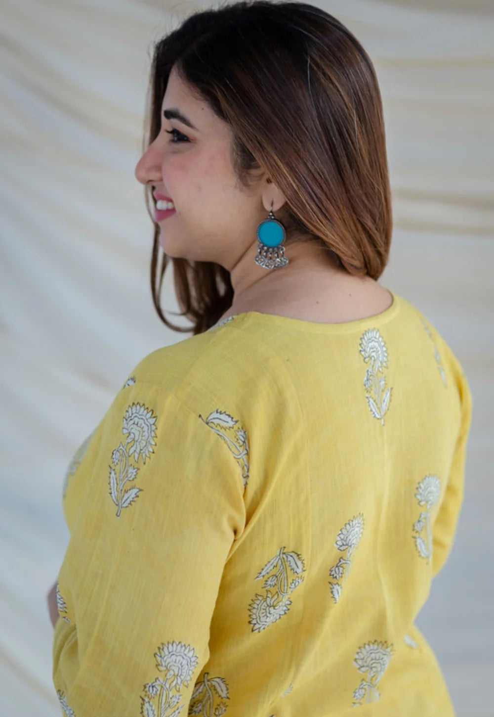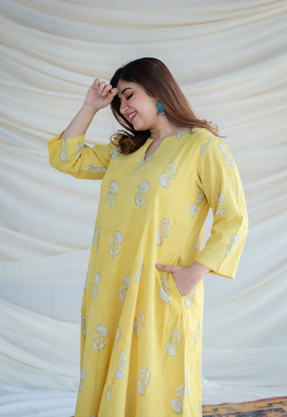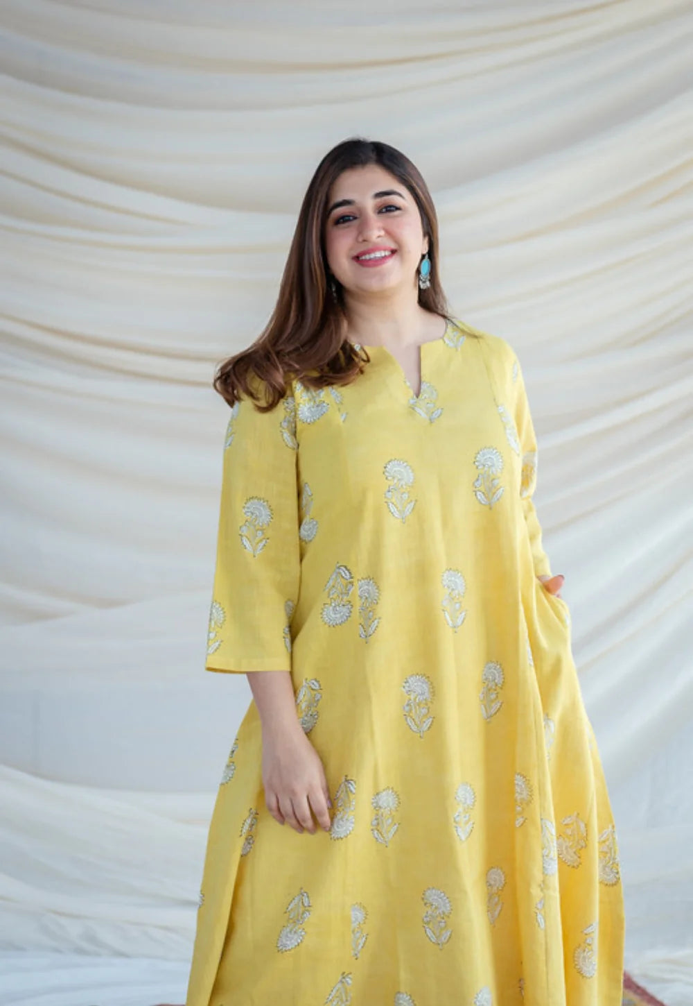 Yellow Dabu Slub Cotton Kali Kurta With HandBlock Printed